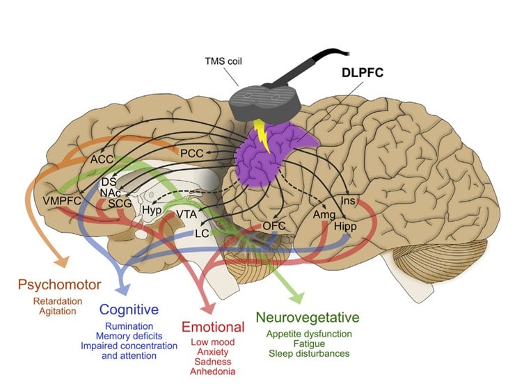 TMS (or transcranial magnetic stimulation) refers to a medical treatment which is delivered by a device that generates changing magnetic fields. There are many devices which can be used by clinicians. At present, in general, the devices are positioned over the area of the brain which has been targeted by the clinician. For depression, this area is the prefrontal cortex of the brain. These magnetic fields can create electrical activity in the nerve cells. Biological effects of TMS involves complex mechanisms leading to changes in blood flow and metabolism at stimulation site, alterations of monoamine concentrations and receptors modulation, induction of neurogenesis (BDNF upregulation), enhanced neuroplasticity and increase in grey matter and hippocampal volume. TMS stimulation effects not only the targeted area, the prefrontal cortex, but also the connected areas of the brain, the cingulate, amygdala, hypothalamus, and thalamus.