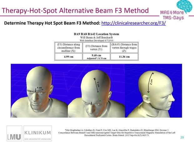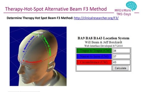 At STW center, we use ‘Alternative B3 method’ for determining the precise location of ‘Therapy Hot Spot’, which requires 3 different head measurements. Therapy hot spot is ‘ left dorsolateral prefrontal cortex’ and this method is most widely practiced in clinical settings. Because this method takes into account patients head measurements, location thus found is very close to the actual MRI based DLPFC.