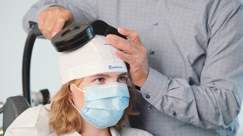 MagVenture TMS Therapy as an adjunct therapy for OCD uses short magnetic pulses to target the exact areas in the brain that are affected by OCD. The magnetic coil that delivers the TMS treatment is placed on top of the head as shown on the picture above. Clinical studies have demonstrated that rTMS over this part of brain, the prefrontal cortex, is safe and effective for the adjunct treatment of OCD.