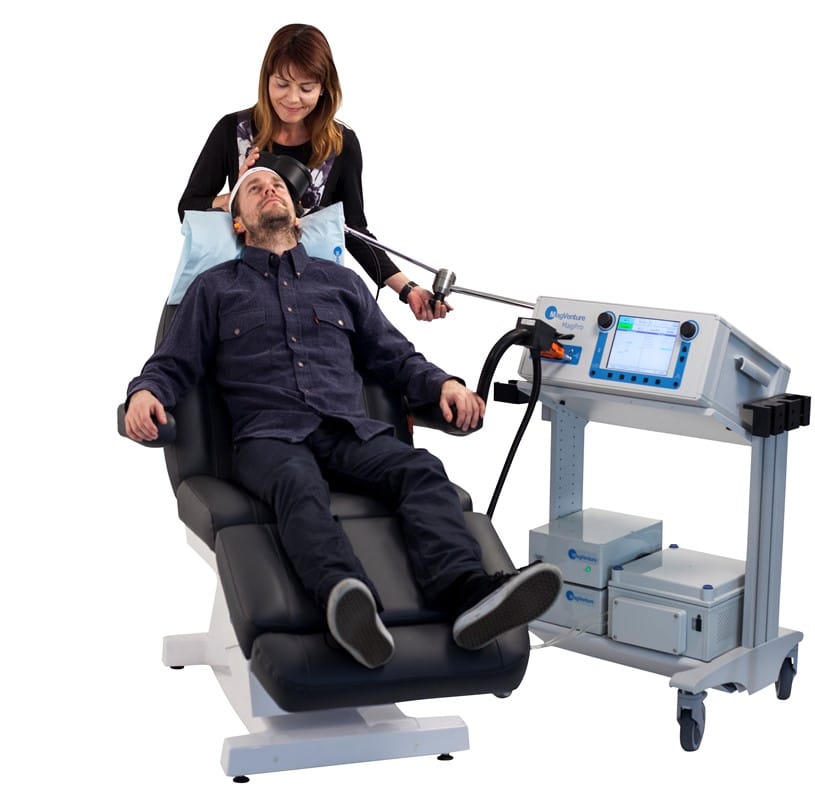 The magnetic coil which delivers the TMS is positioned on the left front side of the head, over the part of the brain called the Left Dorso-Lateral Prefrontal Cortex. You will hear a clicking sound and feel a tapping sensation on your head when the magnetic pulses are delivered. Many patients are able to watch television or read during treatment. TMS therapy is administered at our center by highly trained staff and each rTMS session lasts 19 minutes, and are typically given five days a week for six to eight weeks. Side effects are minimal and usually only involve discomfort at the site of treatment. Patients are able to work, go to school, or continue any of their daily activities.